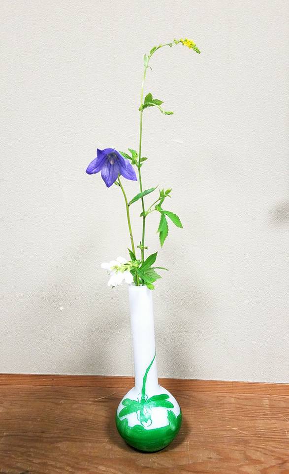 食卓に新しい顔。 田中信彦さんの新作、白磁茶碗。 鈴木玄太さんのガラス一輪挿し。 庭に咲いた松本仙翁と瑠璃虎の尾。