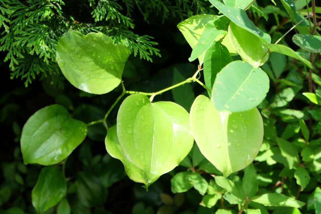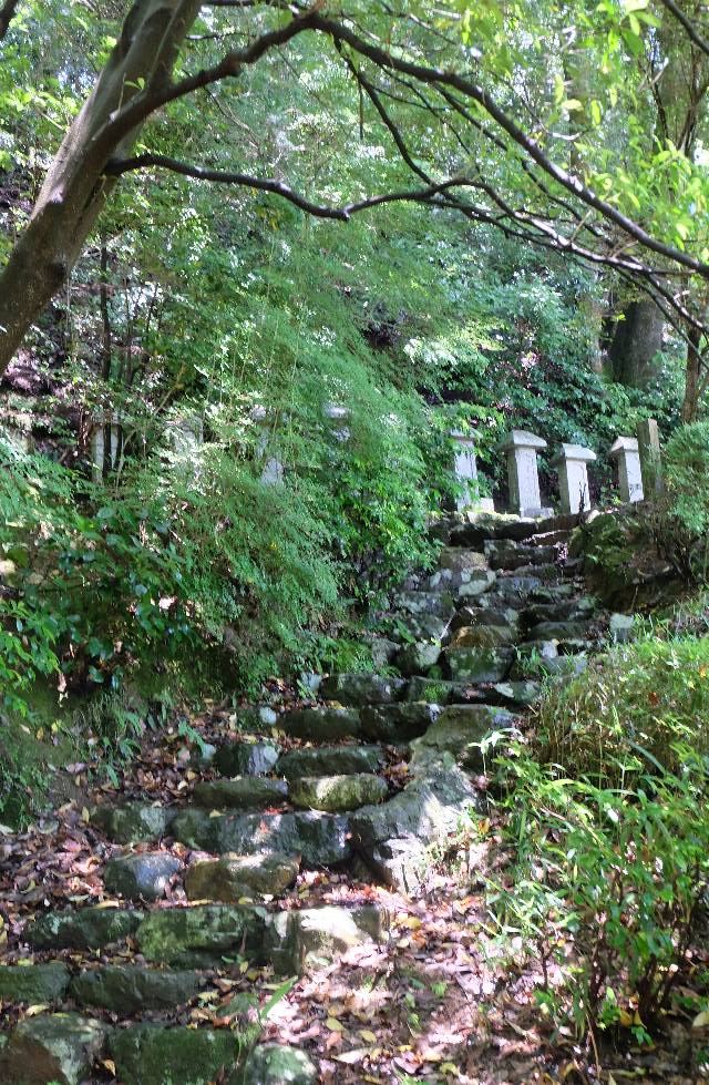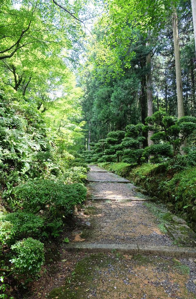 早朝の雨に潤う参道を歩むと