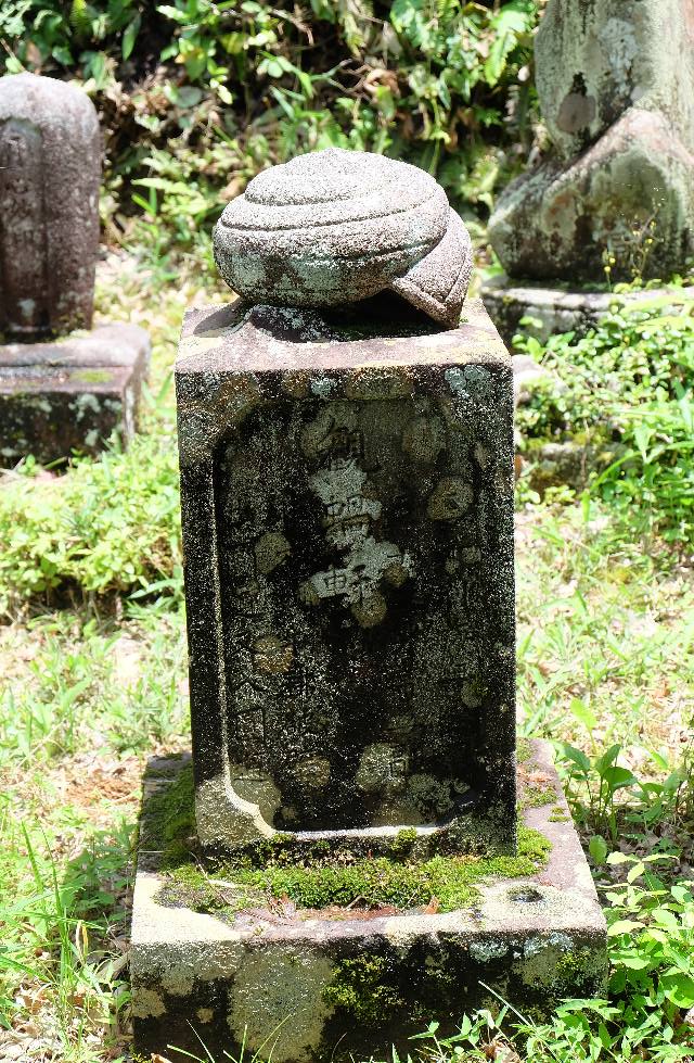 起上がり小法師のような自然石あり巨大カタツムリを載せた墓あり