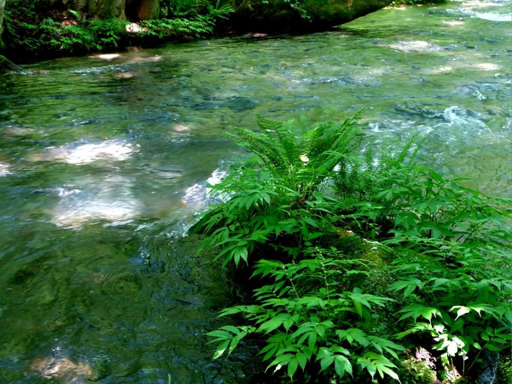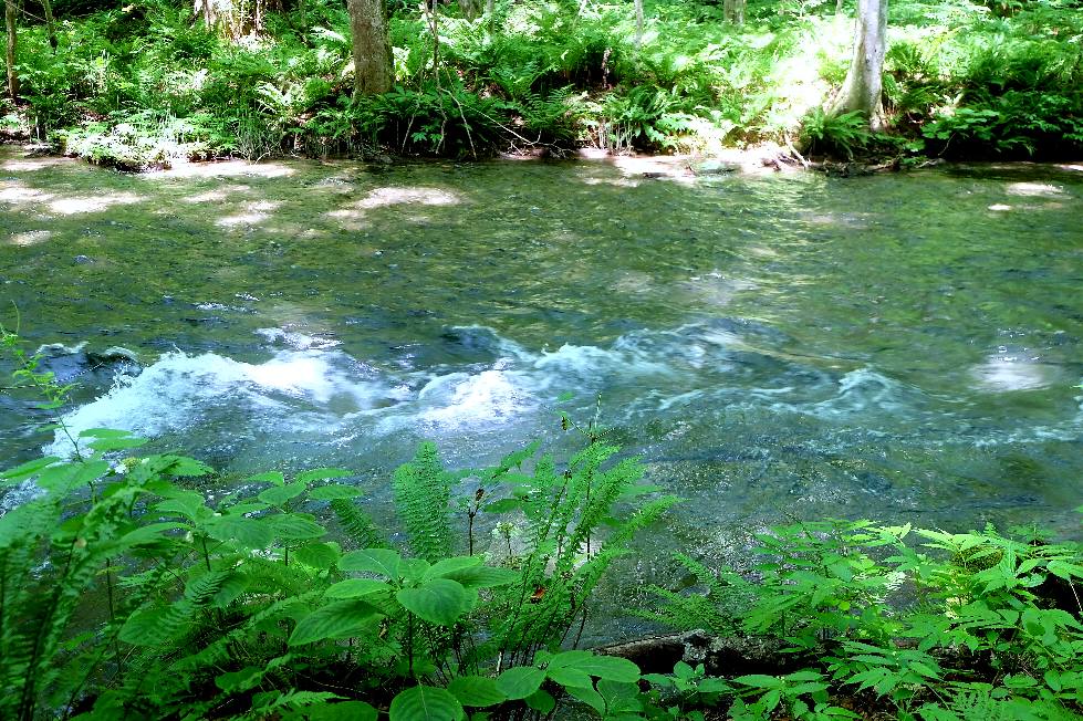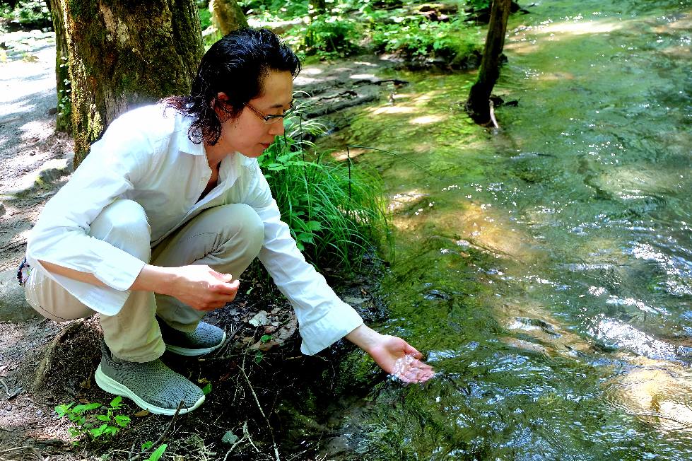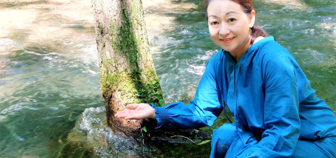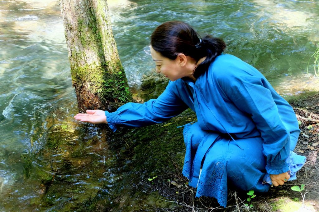 川風の中で清水と戯れる