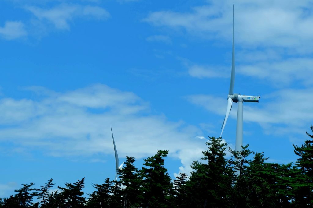 間もなく風力発電のファンが見えた